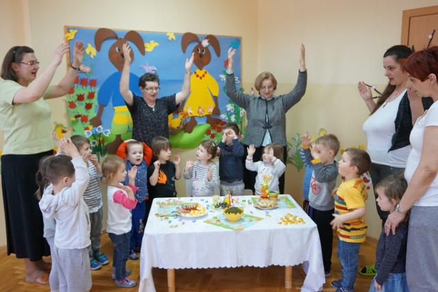 24 marca 2016r., kiedy rozpoczęło się Triduum Paschalne zebraliśmy się na naszej dużej sali, by złożyć sobie wielkanocne życzenia. Wszystkie dzieci wraz z całym personelem podzielili się symbolicznym jajeczkiem i potrawami jakie znajdują się w świątecznym koszyczku. Wszyscy otrzymali upieczone babeczki i rzeżuchę, którą sami posadzili.