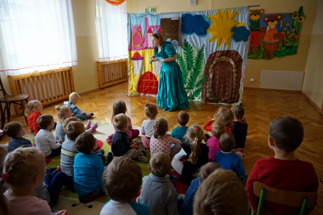 21 września 2016r. w naszym przedszkolu zagościł Teatr "Magik" z Białego stoku i aktorzy zagrali przedstawienie pt. "Uratujmy Krainę Baśni". Wszystkie dzieci wzięły udział w przedstawieniu. Obejrzeliśmy piękną opowieść o wartości baśni i bajek. Aktorzy opowiedzieli dzieciom zabawne, a jednocześnie ciekawe i pouczające historie. Dzieci z zainteresowaniem śledziły losy Jacusia i Telewizorka , którzy nakłaniali wszystkich do grania na komputerze oraz oglądania telewizji – twierdząc, że to o wiele lepsze od czytania książek. Jednak nasze dzieci przekonały Jacka, że książki i bajki są prawdziwym bogactwem. Pomogły również uratować Wielką Księgę Baśni i zobowiązały się do codziennego czytania.